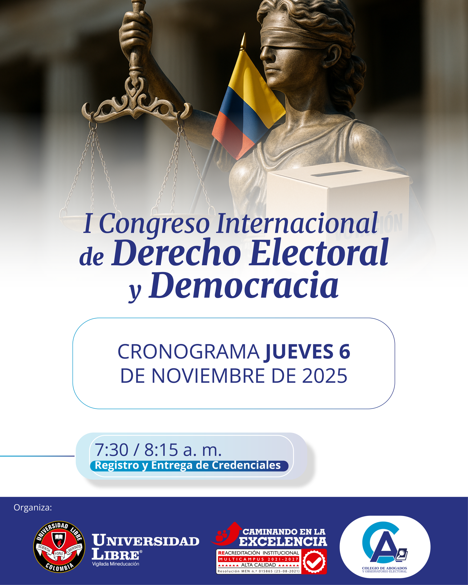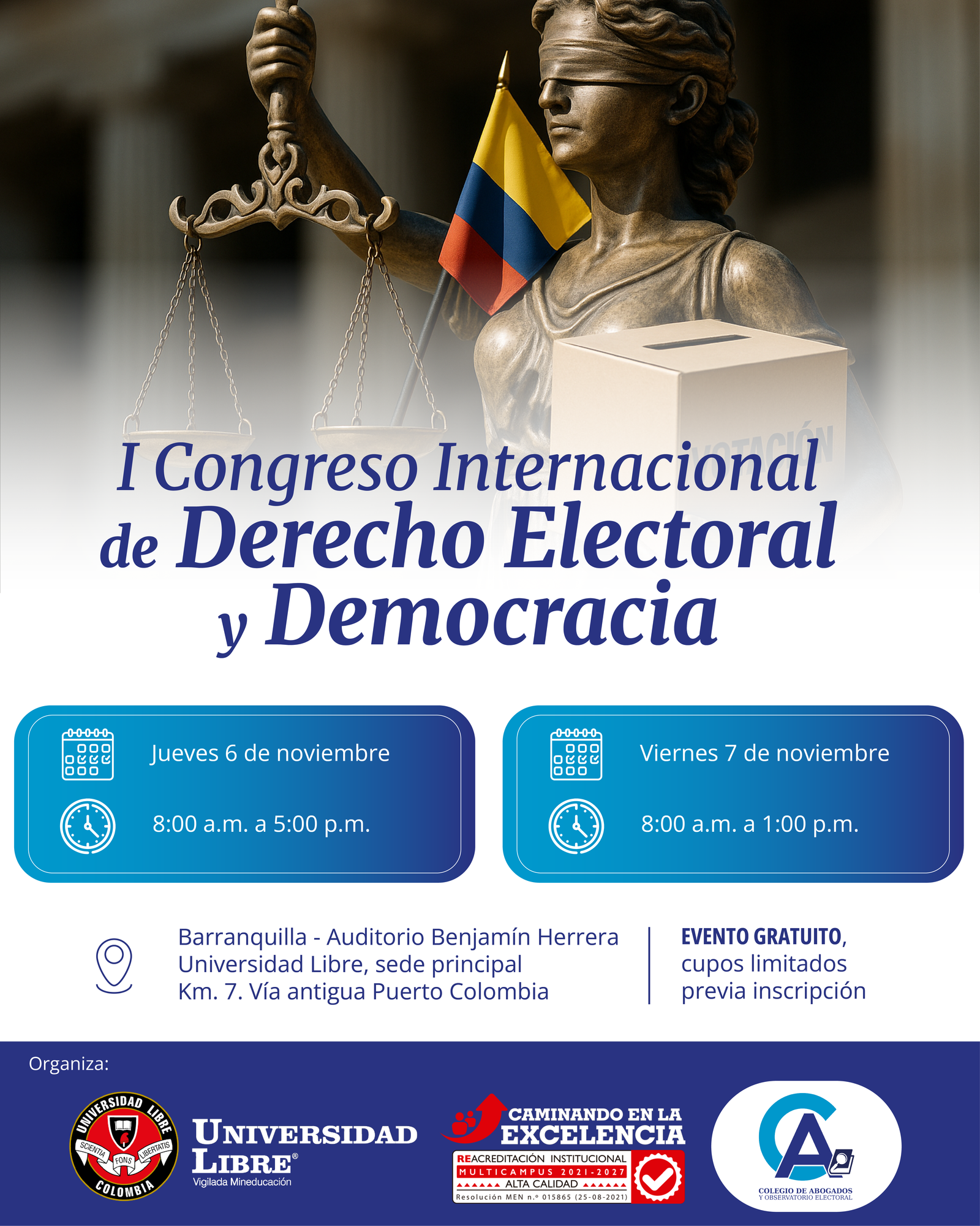 🗳 ¡Construyamos juntos una democracia más fuerte! Participa en el I Congreso Internacional de Derecho Electoral y Democracia 📅 6 y 7 de noviembre 📍 Universidad Libre – Barranquilla 🎟 Evento gratuito, previa inscripción en el siguiente link: forms.office.com/r/zTFCsvj8AR Organiza: Universidad Libre,
